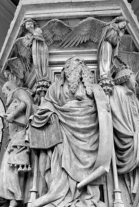 De la mémoire visuelle des gypsothécaires à qui nous avions fait visiter la collection de plâtres du lycée en septembre 2019, avait immédiatement surgi une identité : Zacharie, (un prophète juif du VIè siècle av n.è, ayant « annoncé » Jésus selon les chrétiens). Le nom d’Albi avait même été murmuré mais des travaux de restauration dans le déambulatoire de la cathédrale Sainte-Cécile nous empêchèrent de vérifier si le Zacharie, qui y veille depuis 1480 en compagnie d’autres personnages de l’Ancien Testament, était bien l’original du « nôtre ». Rien à regretter, la piste était fausse. En feuilletant un livre, nous sommes tombés sur le « bon », sculpté 76 ans plus tôt par Claus Sluter et son atelier, à la Chartreuse de Champmol à côté de Dijon. Sur la photo de première page du présent numéro, on peut identifier le prophète à son nom, écrit en grandes lettres gothiques, mais aussi à l’inscription latine sur le phylactère, signifiant : « ils pesèrent mon salaire à trente deniers d’argent » (Zacharie. XI,12).