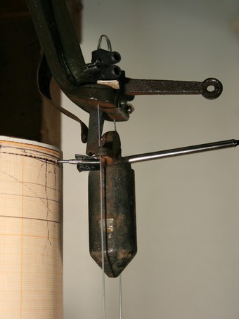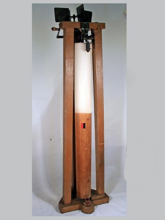 Description : la machine comporte un cylindre en bois pouvant tourner autour d’un axe vertical , et un solide en fonte de forme cylindro-conique muni d’un stylet pouvant tomber en chute libre guidé par 2 fils de fer tendus . La rotation du cylindre est obtenue par la chute d’un poids suspendu à une ficelle enroulée autour d’un treuil . Un système d’ailettes permet d’obtenir une rotation uniforme du cylindre .