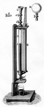 Description : Cet appareil est composé de deux tubes de verre (A) et (B) contenant du mercure et d’un ballon (M). Le tube (A) de plus gros diamètre, est mastiqué par ses deux extrémités à deux robinets métalliques (b) et (d). On peut adapter au robinet (b) soit un autre robinet (a) dit à cuvette (n) qui communique avec un entonnoir (C) soit l’entonnoir directement soit encore le ballon (M). Au-dessus du robinet (d) se trouve une tubulure latérale qui met en communication les deux tubes. Une échelle placée entre ces deux tubes permet de mesurer les hauteurs de colonnes de mercure.L’ensemble est maintenu vertical car fixé à un support en bois.