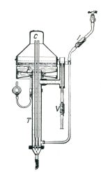 Description : l’appareil est formé d’une cuve cylindrique en cuivre, prolongée vers le haut par une partie conique (C) fermée. Deux tuyaux verticaux provenant de l’intérieur de la partie supérieure de la cuve sont reliés à un entonnoir par lequel s’écoulera l’eau distillée. Ces deux tuyaux traversent la base de la cuve puis un réfrigérant cylindrique en cuivre dans lequel circule un courant d’eau froide dont une partie alimente également la cuve et sera donc distillée. Pour assurer la distillation en continu, le dispositif (V) est installé pour maintenir le niveau d’eau constant dans la cuve .