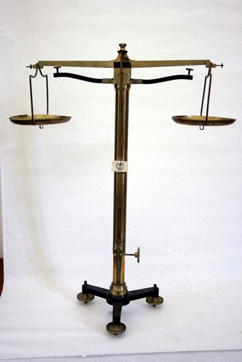 Description : balance dont les plateaux comporte un crochet . Le fléau peut s’abaisser ou se reler grace à une crémaillère.
