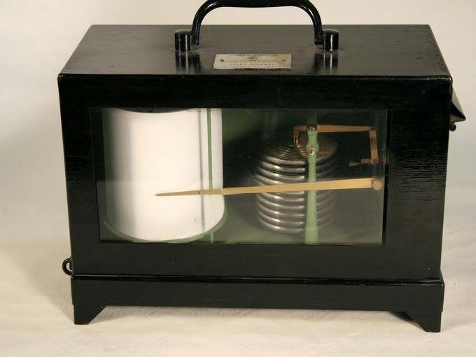 Description : l’appareil est constitué de plusieurs boîtes circulaires dans lesquelles on a fait le vide. La boîte supérieure est relié à une aiguille garnie d’encre par l’intermédiaire de leviers. L’aiguille est placée devant un cylindre garni d’une feuille d’enregistrement. Le cylindre fait un tour en une semaine.