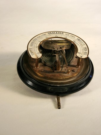 Description : l’appareil se compose d’une boîte métallique circulaire vide d’air, de surface ondulée. La partie supérieure de la boîte est reliée par l’intermédiaire de leviers à une aiguille pouvant tourner devant une graduation.