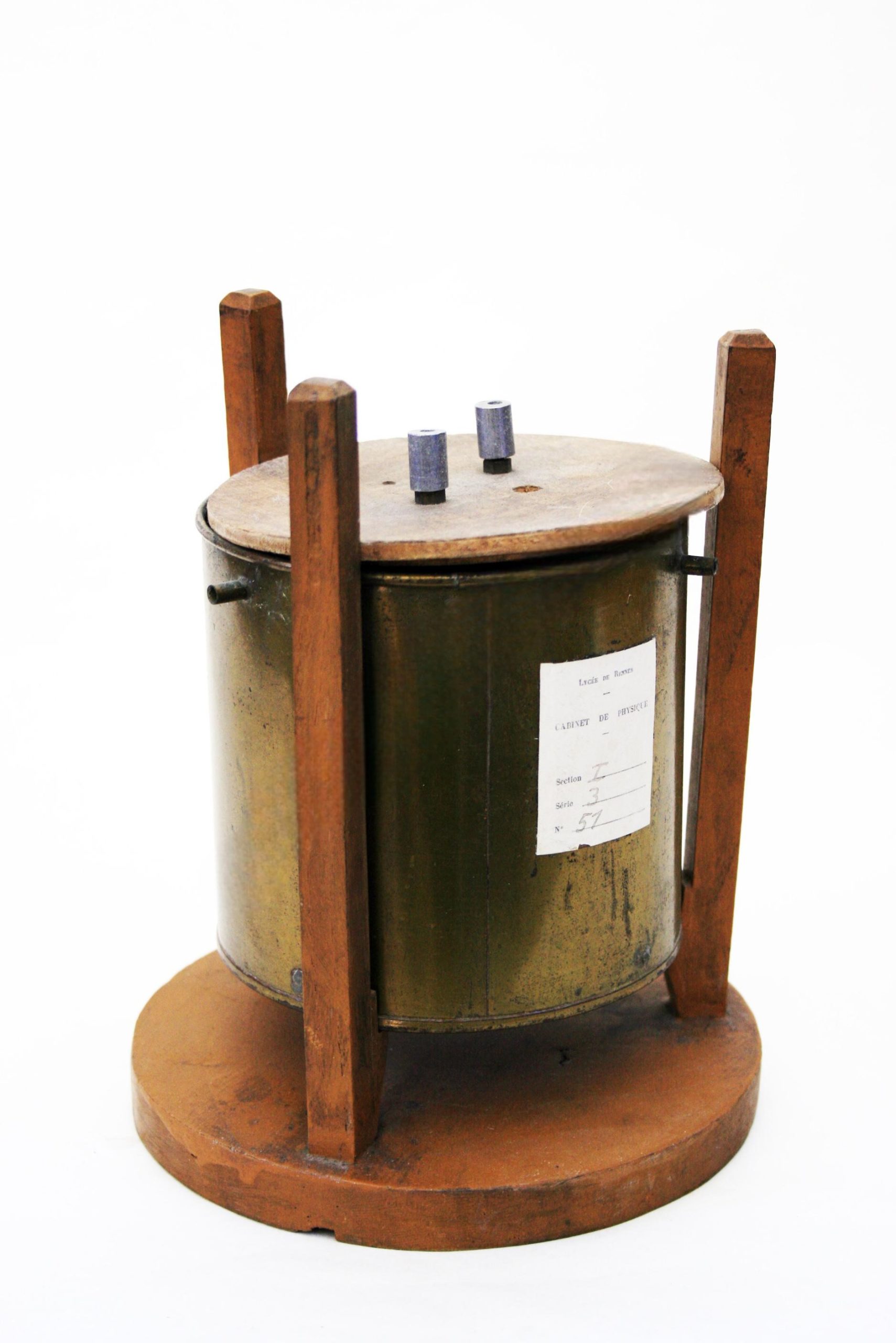 Description : le calorimère se compose d’un vase en laiton contenant de l’eau et dans lequel plongent une résistance électrique, un agitateur et un thermomètre