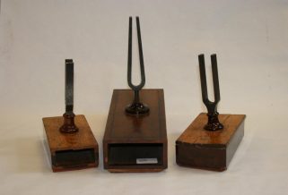 Mode opératoire : on fait vibrer le diapason en tapant sur l’une de ses branches à l’aide d’un petit marteau. Chaque diapason émet une note différente.