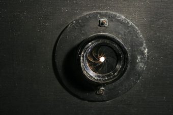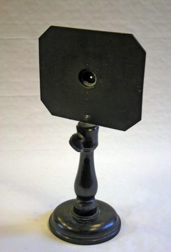 Description : l’appareil se compose d’un disque métallique percé d’une ouverture circulaire. Des lamelles peuvent se recouvrir plus ou moins devant l’ouverture, quand on fait tourner leur monture. Le diaphragme est enchâssé soit dans un support muni d’un pied .