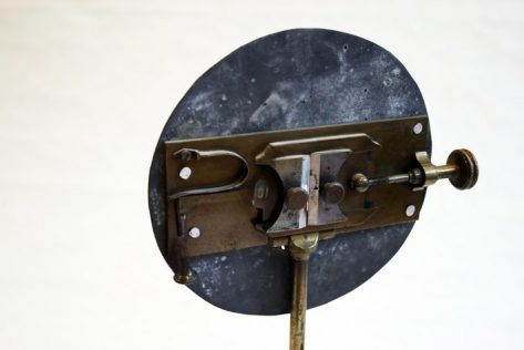 Description : l’apareil est formé de 2 plaques métalliques biseautées qui encadre l’ouverture verticale et rectangulaire d’un support en bakélite. L’une est fixe tandis que l’autre peut être rapprochée de la première à l’aide d’une vis qui peut être graduée.