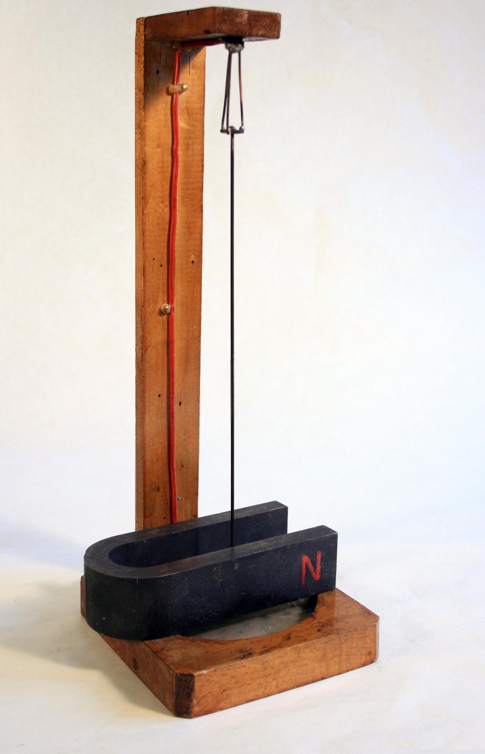 Description : l’appareil est formé d’un fil de cuivre suspendu, pouvant osciller, l’extrémité inférieure du fil plonge dans une cuve contenant du mercure. Le fil est est plcé dans l’entrfer d’un aimant en U.