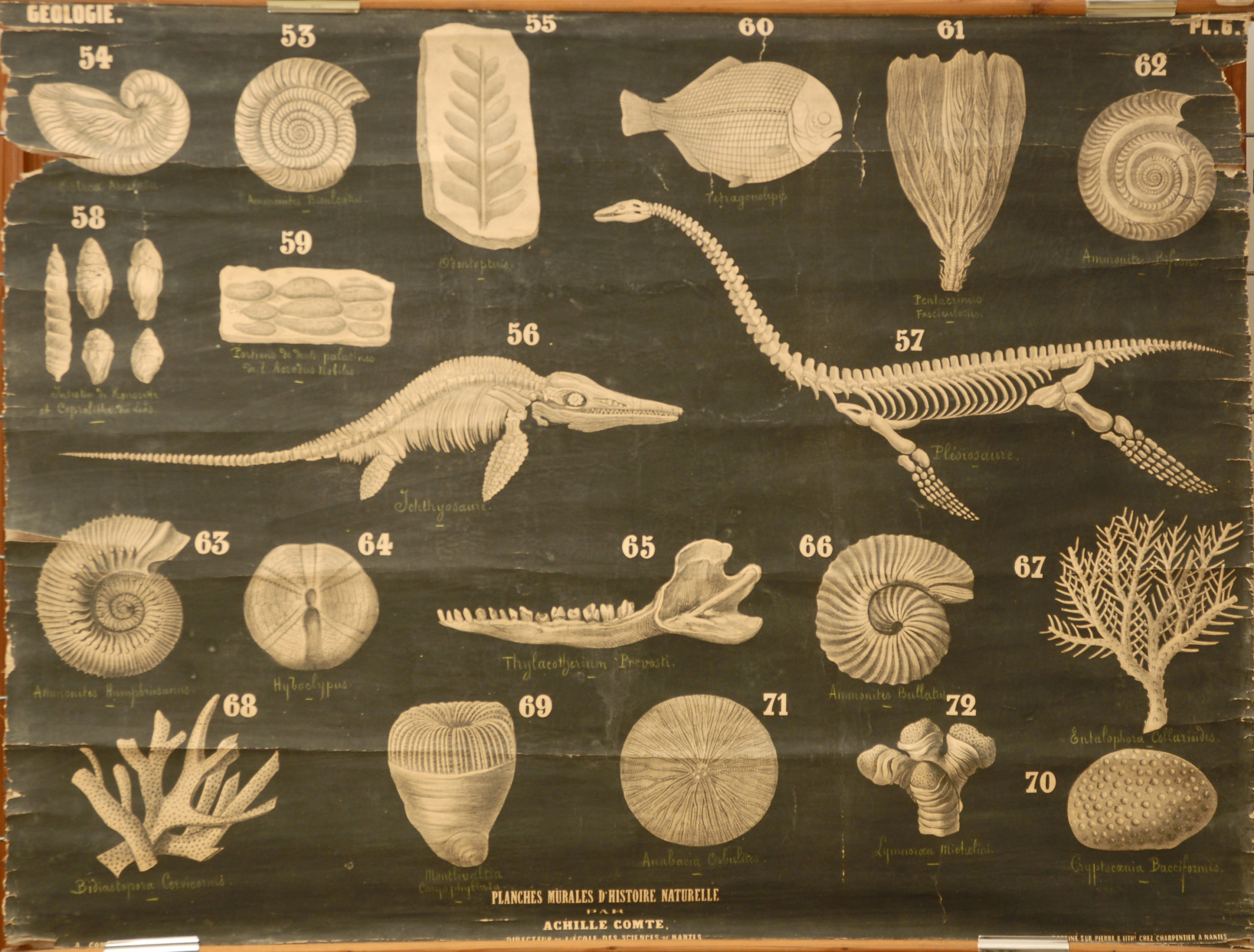 54 Gryphea arcuata- 53 Ammonites bisulcatus- 55 Odontoptéris Cycadea- 56 Ichtyosaurus communis – 57 Plesiosaurus dolichodeirus-58 Intestin de Roussette et coprolites-60 Tetragonolepis (restauré)-61Pentacrinus fasciculosus-62 Ammonites bifrons.