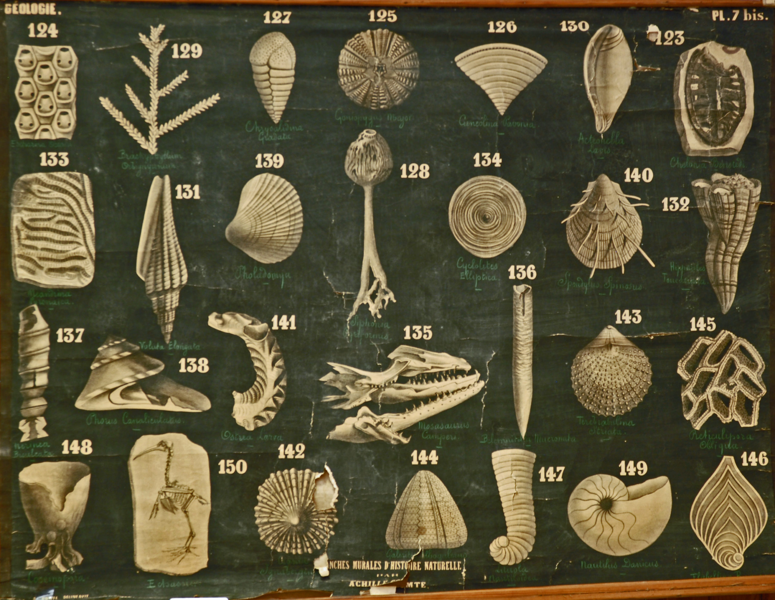 135:Mosasaurus Camperi-136:Belemnitella mucronata-137:Neorinea bisulcata-138:Phorus canalicutus-139:pholadomya aequivalvis-140:Spondylus spinosus-141:Ostrea larva-142Crania Ignabergensis-143:Terebratulina striata-144:Galerites albogalerus-145:Reticulipora obliqua-146:Flabellina rugosa (coupe)-147:Lituola nautiloïdea-148:Coscinopora cupuliformis-150:Squelette d’échassier