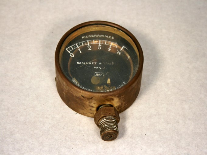 Description : l’appareil est essentiellement d’un tube interne creux dont l’une des extrémiés est reliée à une tubulure fermée par un robinet et dont l’autre extrémité est relié à une aiguille pouvant se déplacer devant un cadran.