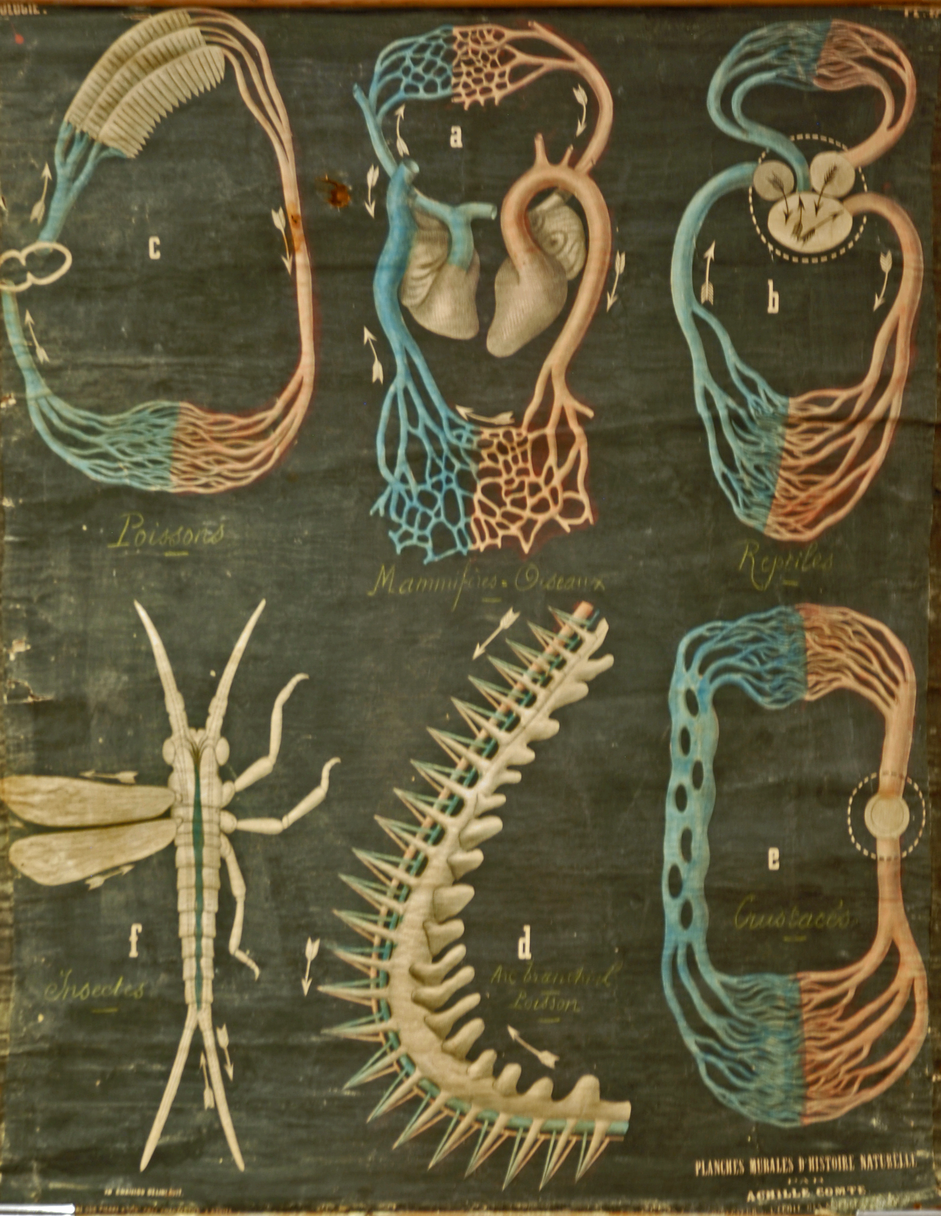 e Circulation du sang chez un crustacé (écrevisse) :le cœur, qui n’a qu’une seule cavité, pousse le sang artériel dans toutes les parties du corps. Ce sang se répand dans les lacunes ,puis passe aux branchies devient artériel ,arrive par deux canaux dans la poche qui contient le cœur, puis entre dans cet organe.