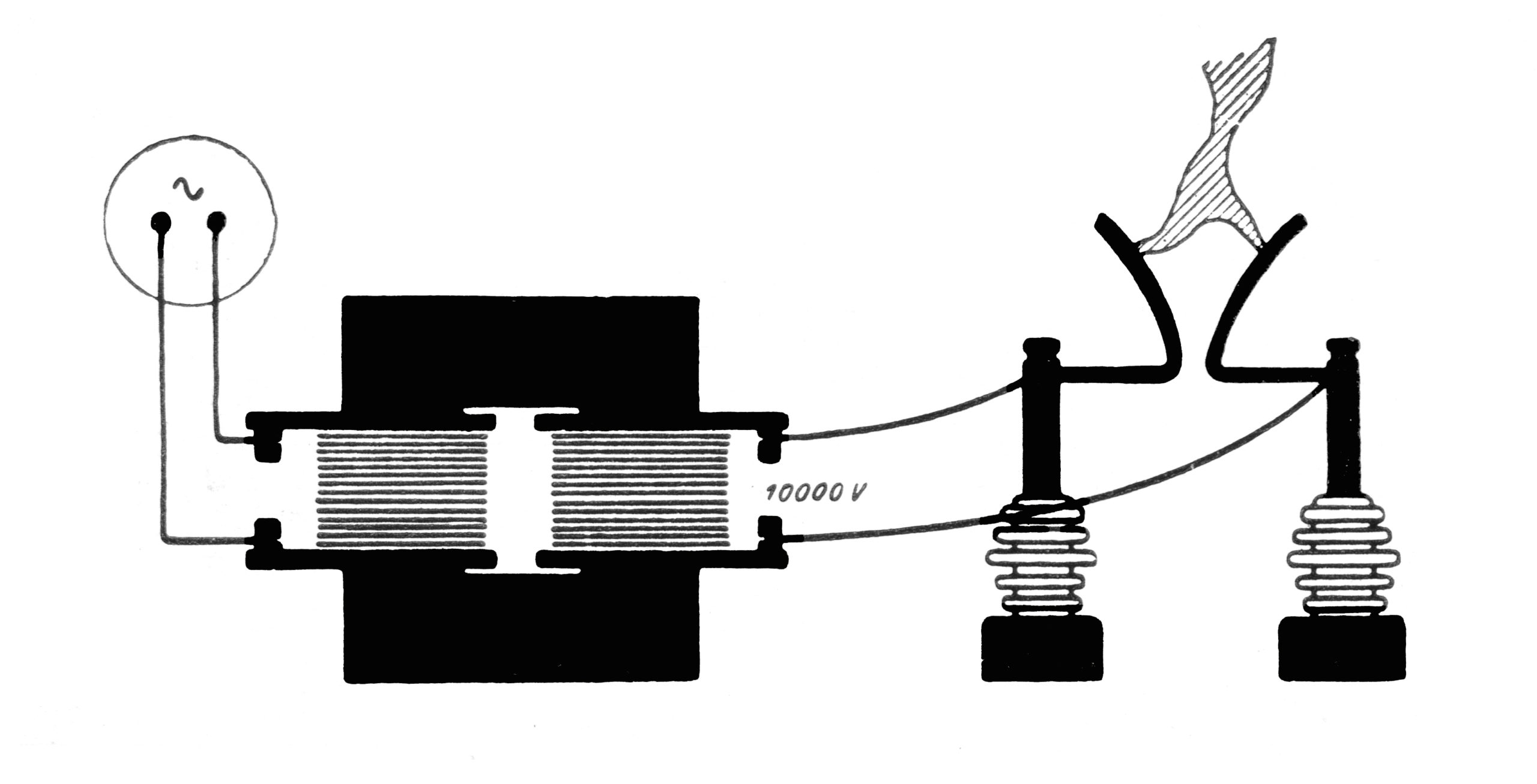 Mode opératoire : la bobine primaire en alimentée en courant alternatif basse tension . La tension aux bornes de la bobine secondaire atteint quelques millier de volts. On oberve alors qu’un arc électrique se forme entre les 2 cornes de la bobine secondaire.