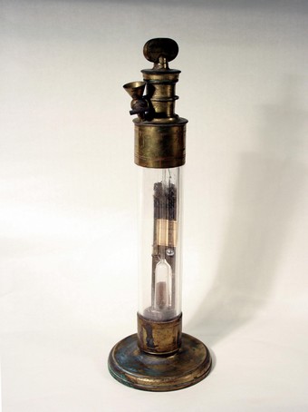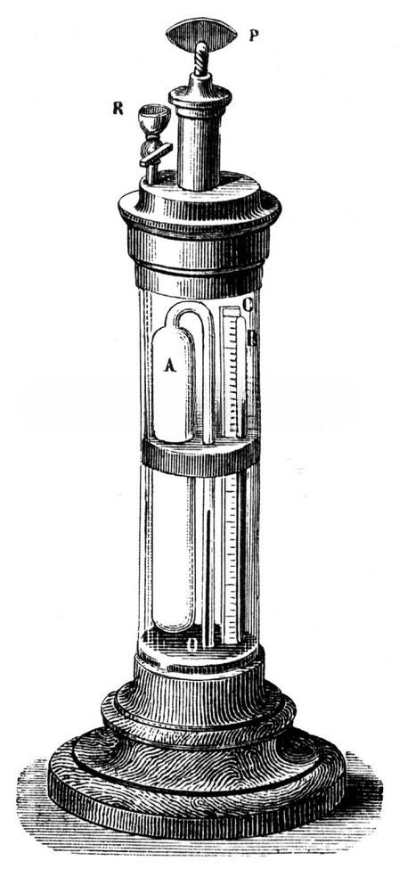 Le cylindre très épais, est mastiqué à sa base dans un pied de laiton et à sa partie supérieure dans la garniture de laiton. Celle-ci porte un entonnoir à robinet (R) servant à le remplir d’eau, à côté duquel se trouve un second cylindre. Ce dernier sert à produire une compression au moyen d’un piston manœuvré par la vis (P).