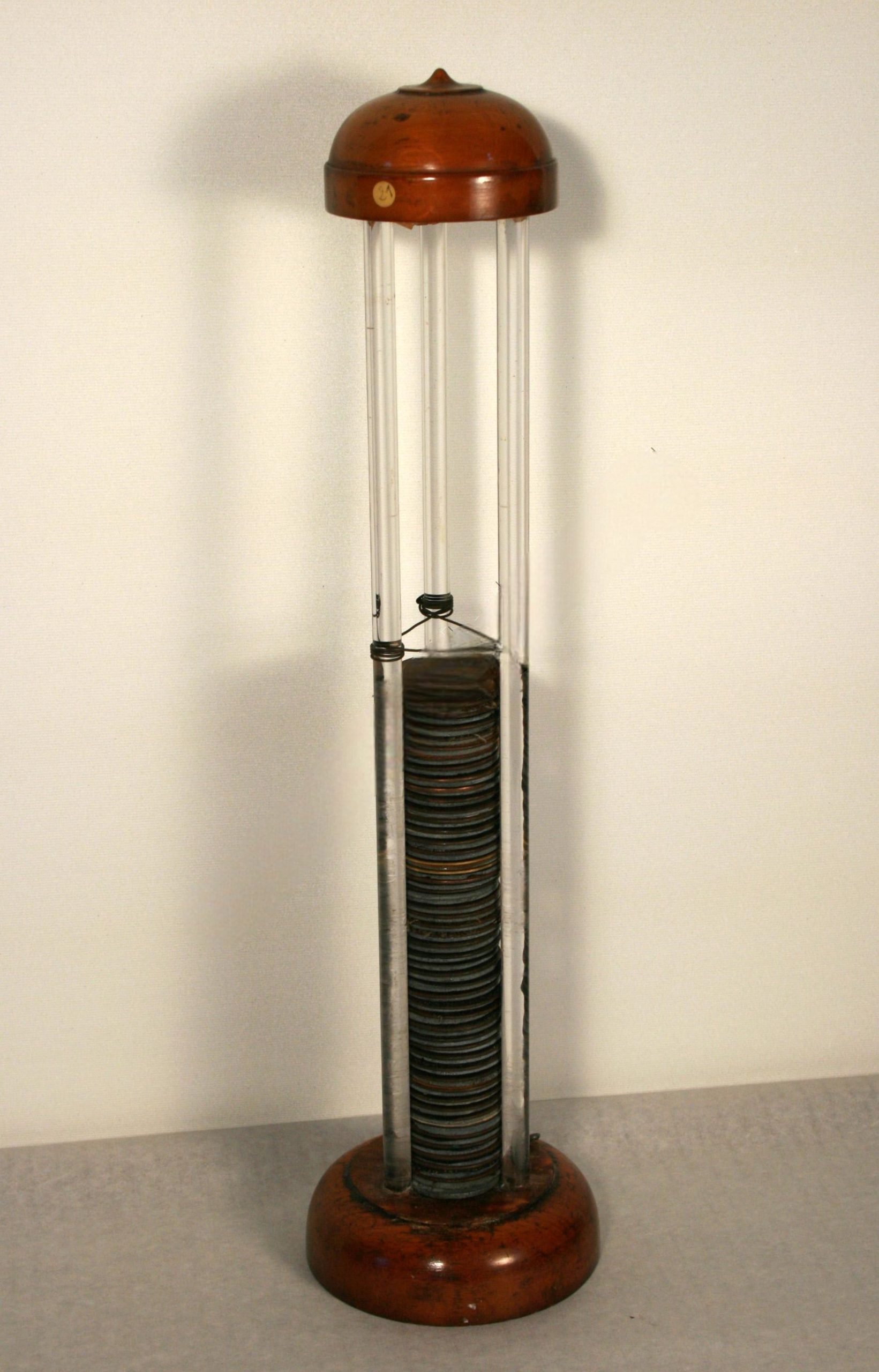 Description : empilement de rondelles de cuivre et de rondelles de Zinc séparées par des rondelles de feutre imbibées d’eau acidulé, citronnée ou vinaigrée. L’ensemble des rondelles est maintenu par trois colonnes de verre de même diamètre, verticales et fixées sur un pied de bois isolant.