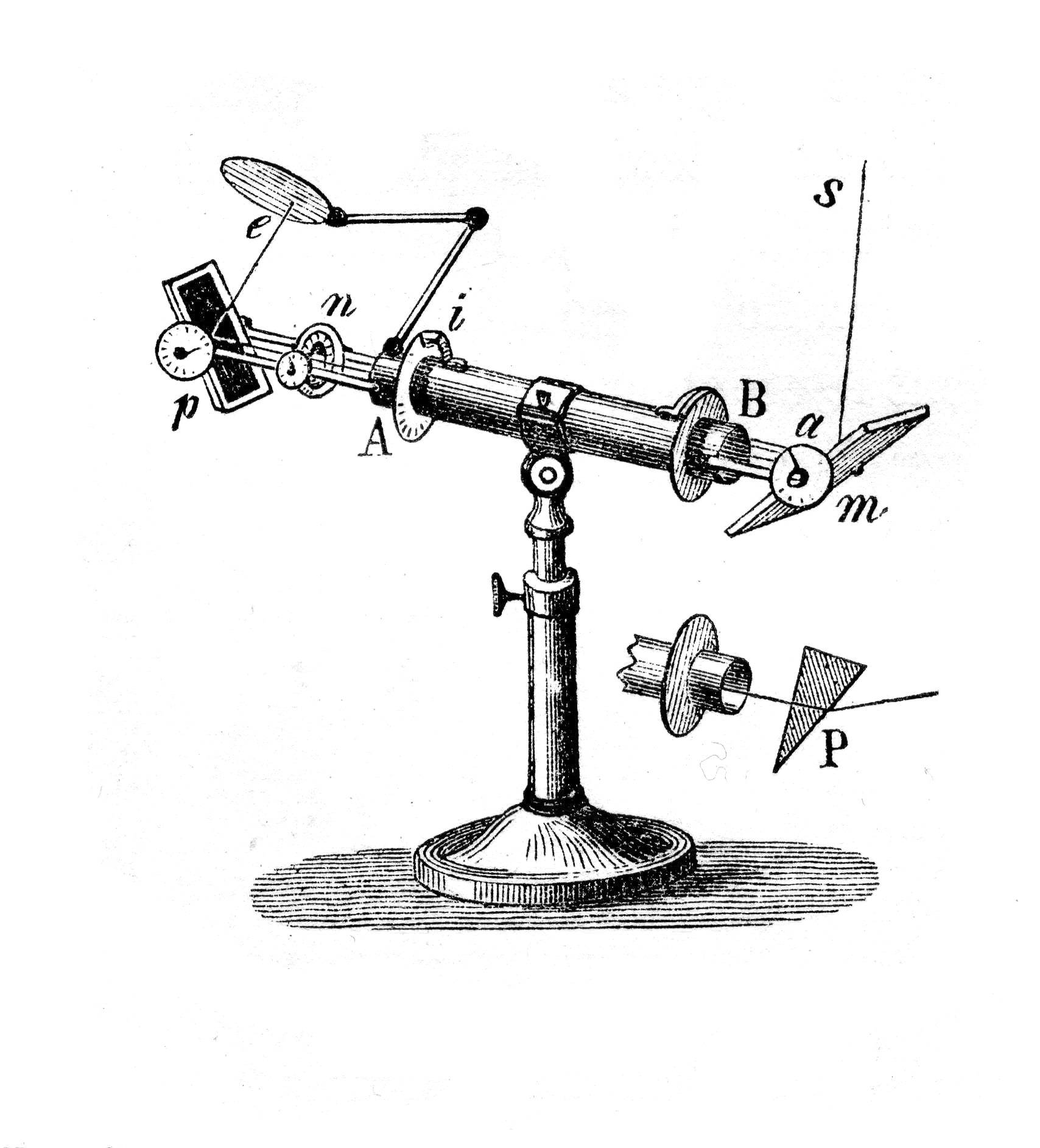 Mode opératoire : quand est reçue sur le polariscope (p), la lumière solaire, ou la lumière d’une lampe à incandescence, réfléchie par la plaque (m), on observe qu’il y a un maximum d’éclat sur l’écran (e) quand les plans de réflexion en (m) et (p) coïncident, ce qui a lieu dans deux positions opposées du miroir (p). Quand ce dernier est tourné de manière que les deux plans de réflexion soient perpendiculaires, on observe le minimum d’éclat.