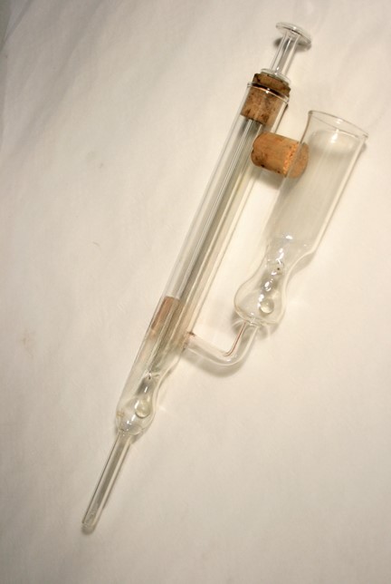 Description : l’appareil se compose de 2 cylindres de verre, dont le plus large est muni d’un piston manoeuvré par un bouton. Il y a également 2 billes jouant le rôle de soupape placées au fond de chacun des tubes.