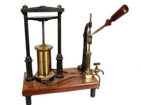 Description : l’appareil se compose d’un grand cylindre et d’un petit cylindre , munis chacun d’un piston. Les cylidres sont reliés entre eux par un tuyau entièrment rempli de liquide.