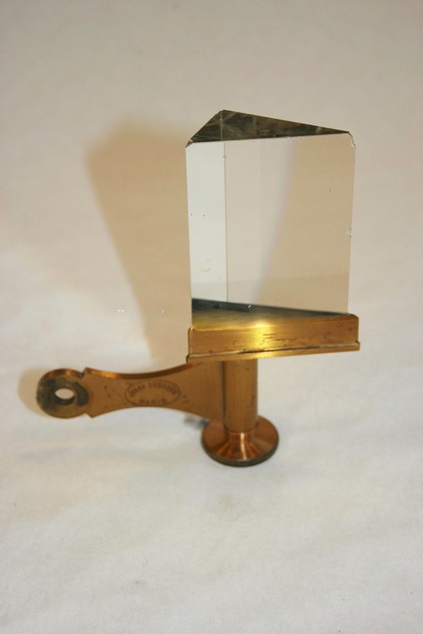 Description : prisme de verre à base triangulaire, monté sur un support articulé.