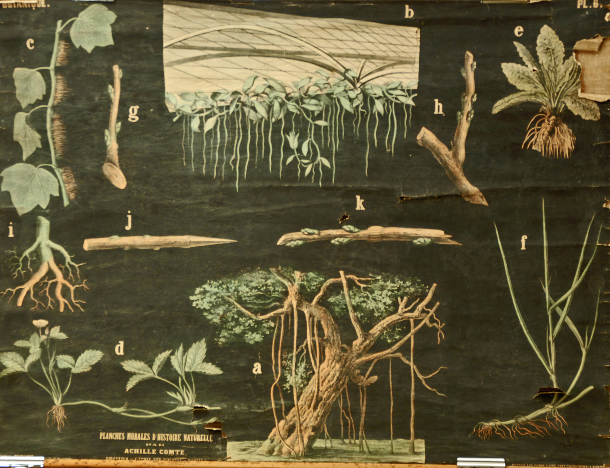 b Tige d’une vanille courant le long d’une serre et émettant des racines adventives aériennes .