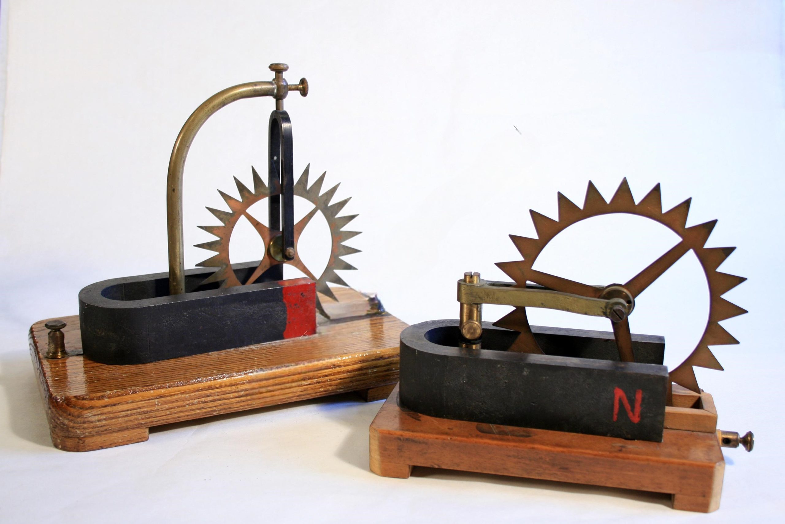 Description : il s’agit d’une roue dentée en cuivre pouvant tourner autour d’un axe horizontal. L’extrémité d’une des dents trempe dans du mercure . La roue est placée dans l’entrefer d’un aimant en U.