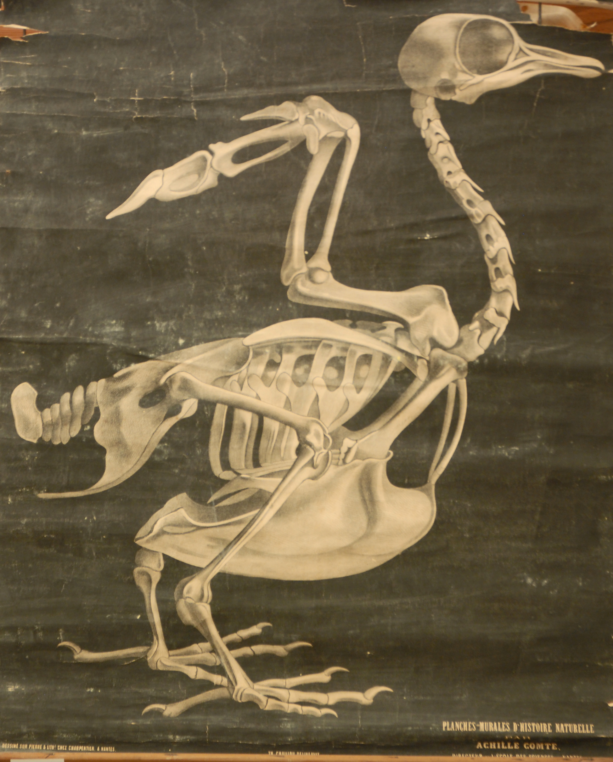 Le développement considérable que présentent le sternum et les ailes indique les habitudes de ces oiseaux qui sont d’excellents voiliers. L ‘aile a été relevée ,afin de montrer comment l’épaule et les côtes s’attachent au sternum.