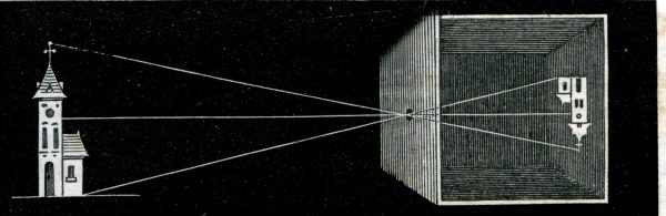 Mode opératoire : on place un objet éclairé devant l’ouverture de la chambre noire. On observe alors l’image renversée de l’objet sur le verre dépoli.