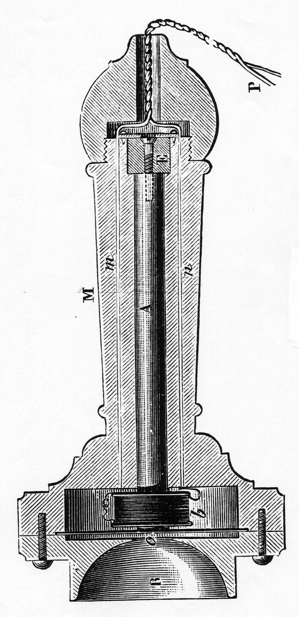 Description : Il s’agit d’un système assurant le couplage électromécanique, composé d’un long barreau aimanté (A), d’une bobine électromagnétique (b) et d’une plaque vibrante (o). Cet appareil se présente sous la forme d’une petite boîte circulaire en bois, munie d’une embouchure (B), portée par un long manche (M), également en bois et contenant le long barreau aimanté (A).Ce barreau se termine dans la bobine magnétique (b) constituée par l’enroulement d’un très long fil de cuivre isolé par du coton dont les extrémités sont reliées à deux fils de cuivre eux aussi isolés mais plus gros (m) et (n). La plaque vibrante (o) en fer très mince et très flexible, est placée entre l’embouchure et la bobine. Elle doit être placée le plus près possible du noyau de la bobine mais assez éloignée pour ne pas entrer en contact avec lui sous l’action des vibrations dues à la voix. L’autre extrémité du barreau (A) est vissée à une plaque liée à l’étui.