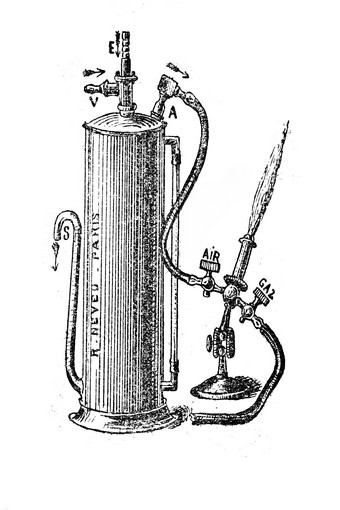Description : Il s’agit d’un réservoir cylindrique muni de quatre tubulures.La tubulure fixée sur la face supérieure comprend la trompe (EV) alimentée d’eau en (E) et d’air en (V). De même, la tubulure (A) de sortie de l’air comprimé, est fixée sur la face supérieure. La tubulure latérale à environ mi-hauteur, (S), sert à la sortie de l’eau. Les deux dernières tubulures latérales sont l’une en-dessous de l’autre ; elles servent à maintenir vertical un tube en verre qui permet de connaître le niveau d’eau dans le corps de cet appareil.
