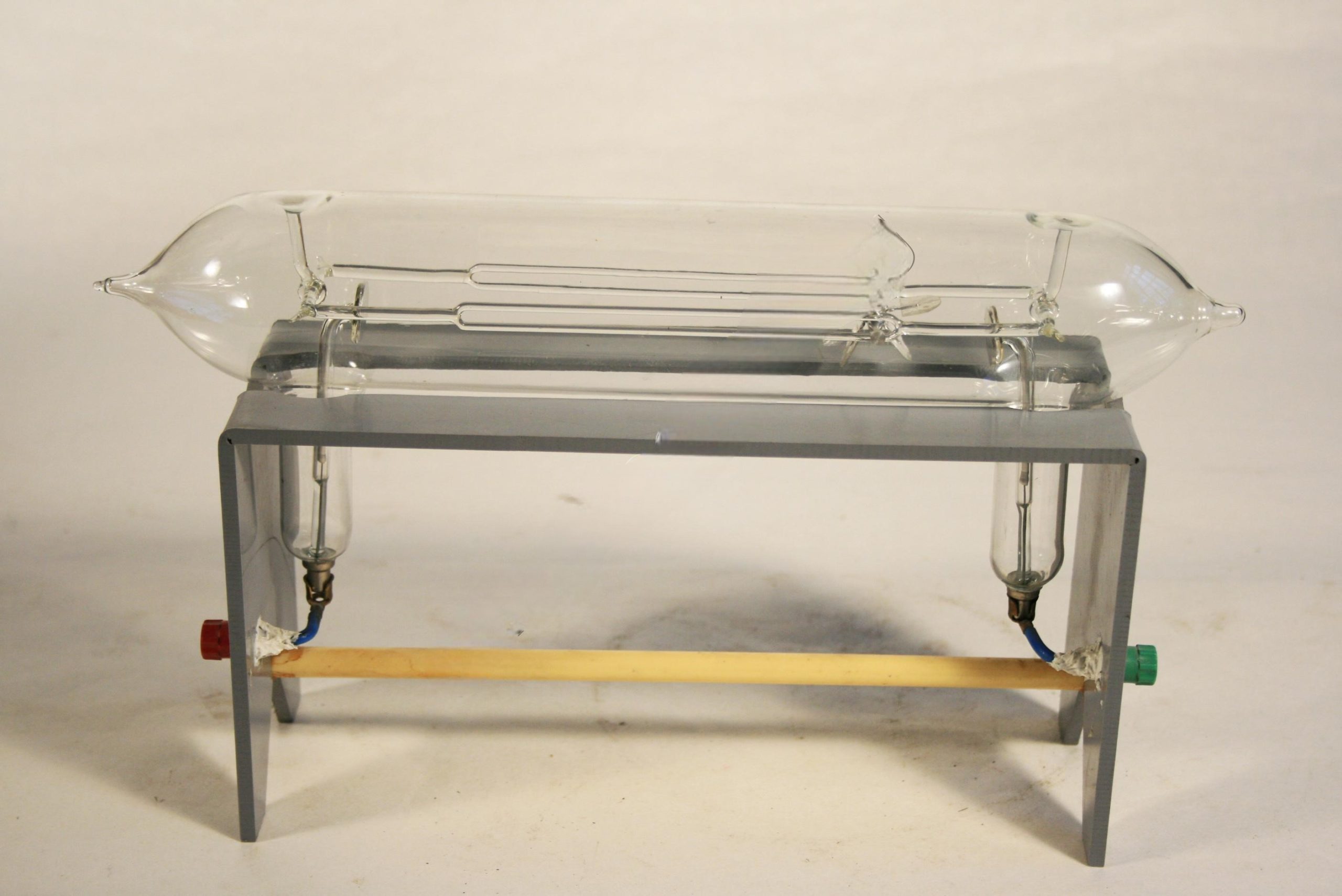 Description : Il s’agit d’un tube cylindrique scellé en verre comportant 2 électrodes. On a fait un vide poussé dans le tube. Dans ce tube un moulinet comportant six ou palettes en mica peut se déplacer dans le tube le long de 2 rails en verre .