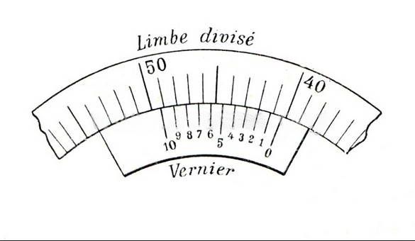 Tout d’abord, on note la division du limbe qui précède immédiatement le zéro du vernier (ici 40). Ensuite, on ajoute le numéro du trait du vernier qui coïncide au mieux avec un trait du limbe (ici le 2e trait)