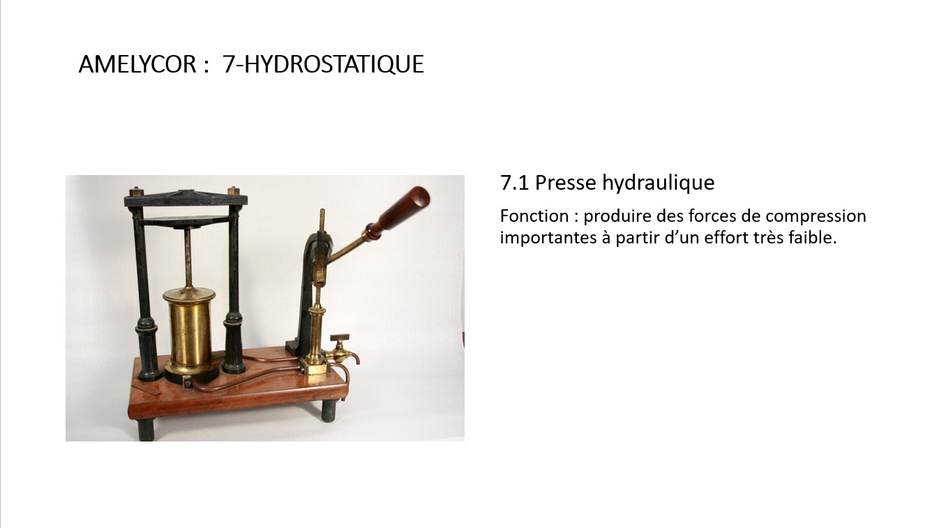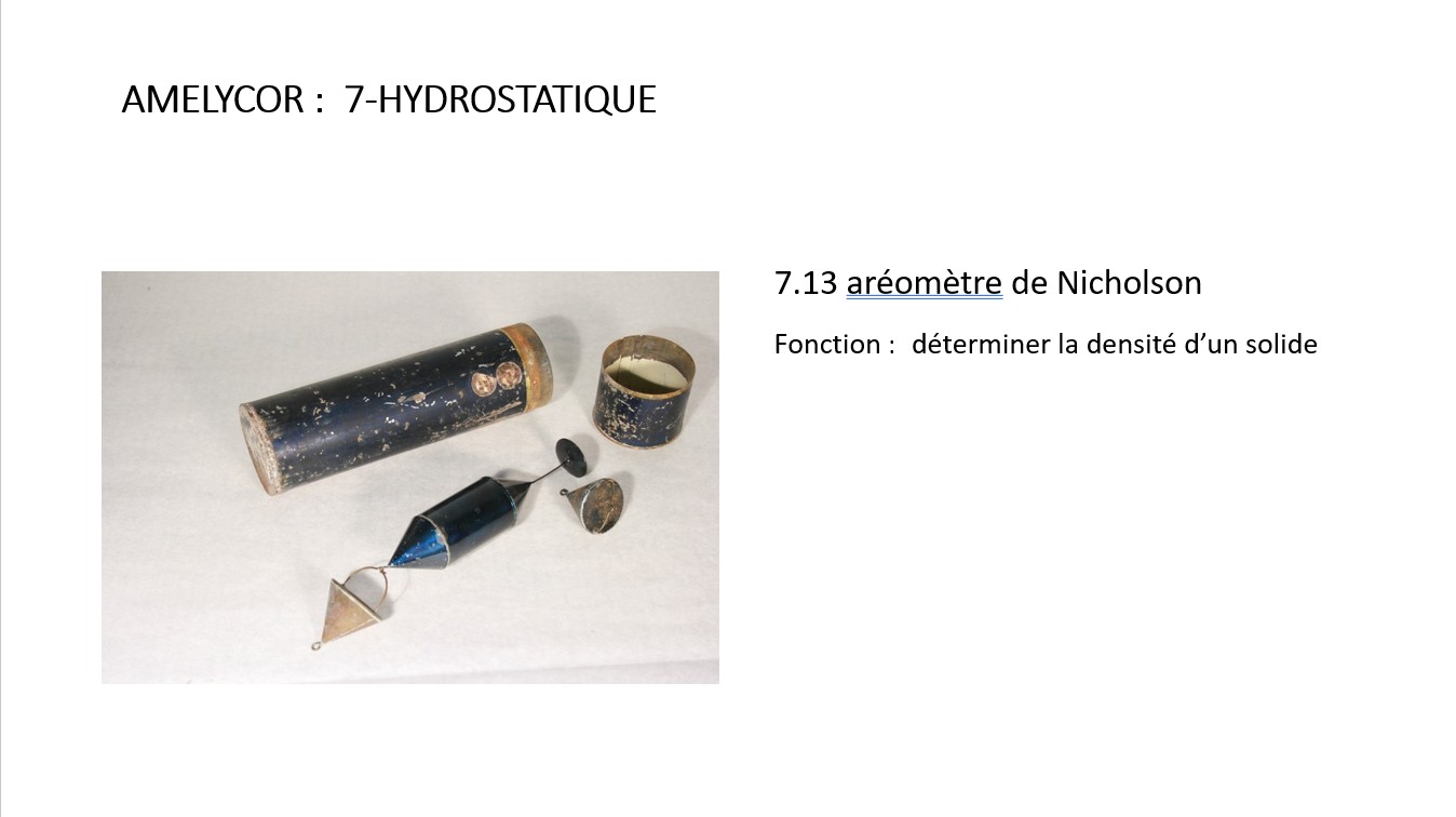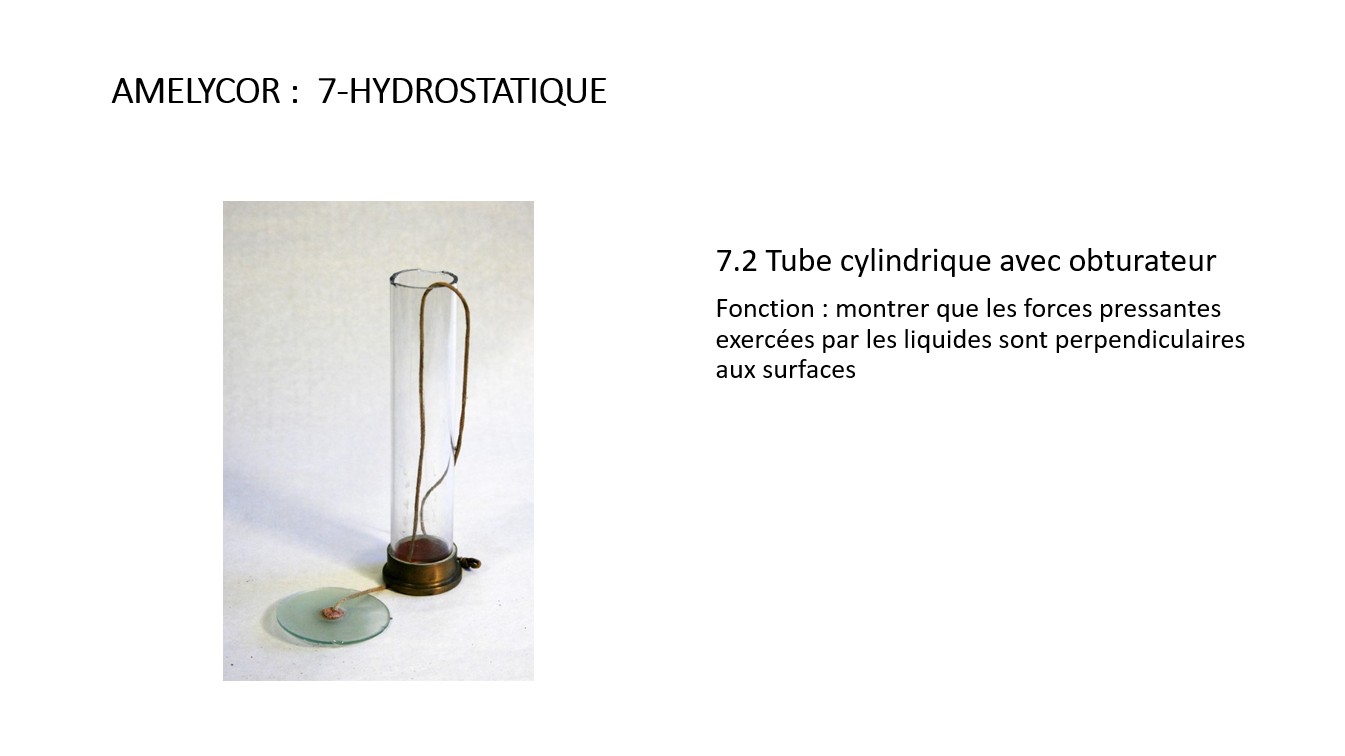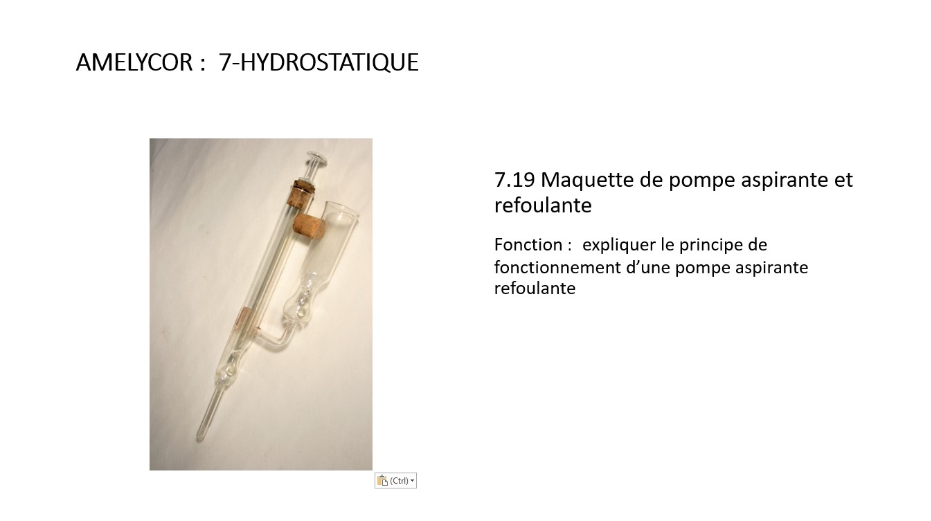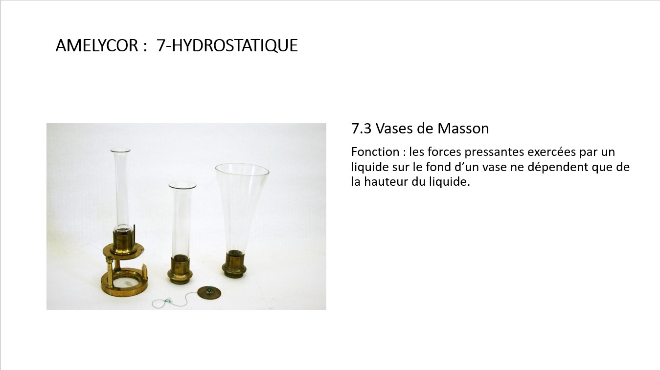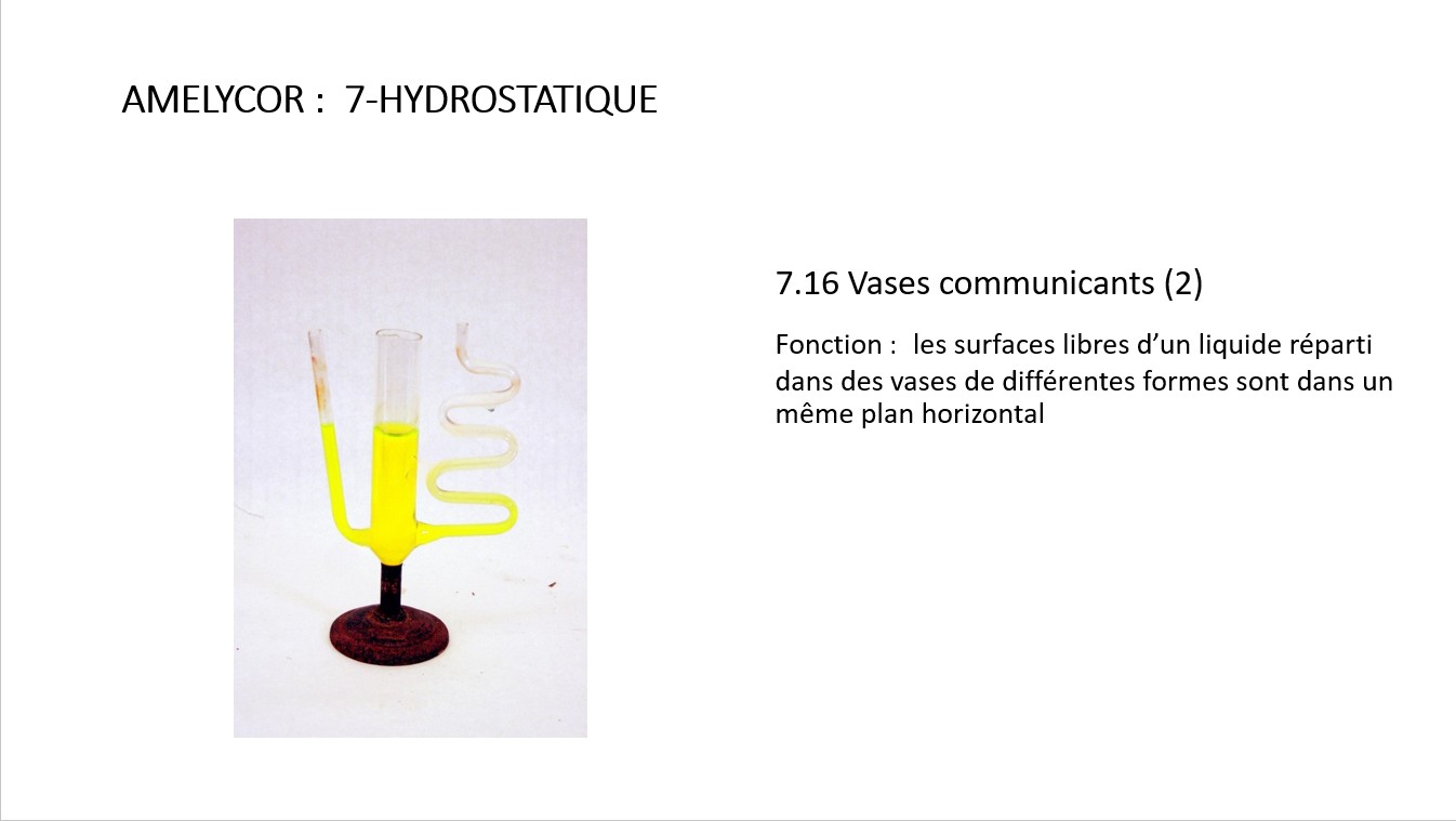 7.16 Vases communicants (2) 7.17 densimère de gay-Lussac 7.18 Ensemble de densimètres 7.19 Maquette de pompe aspirante et refoulante