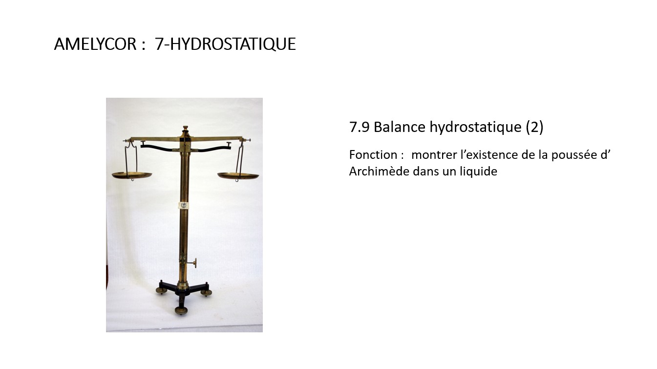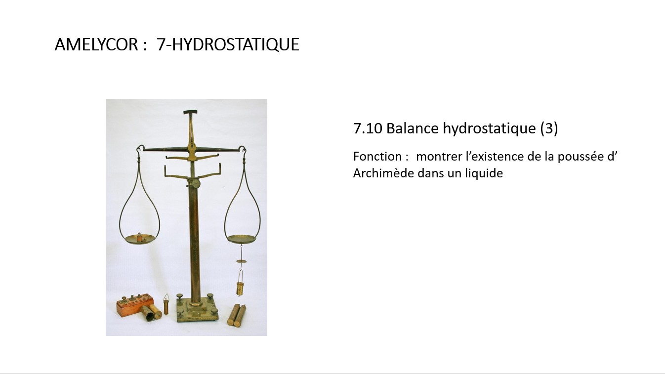 7.8 Balance hydrostatique (1) 7.9 Balance hydrostatique (2) 7.10 Balance hydrostatique (3) 7.12 Tourniquet hydraulique 7.13 Aéromètre de Nicholson 7.15 Vases communicants (1)