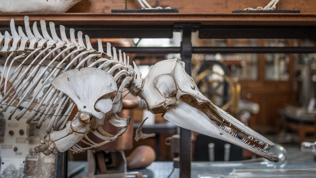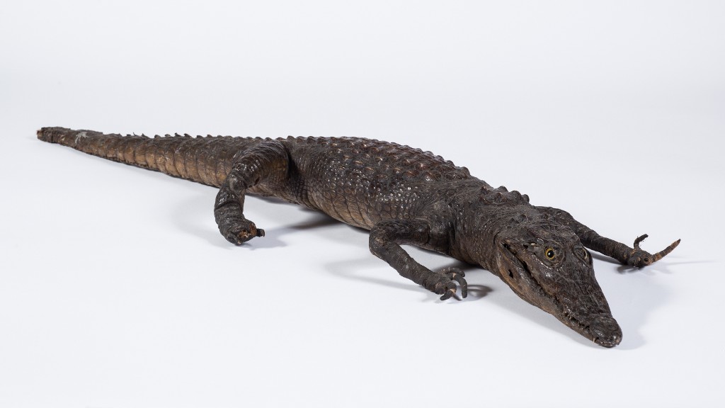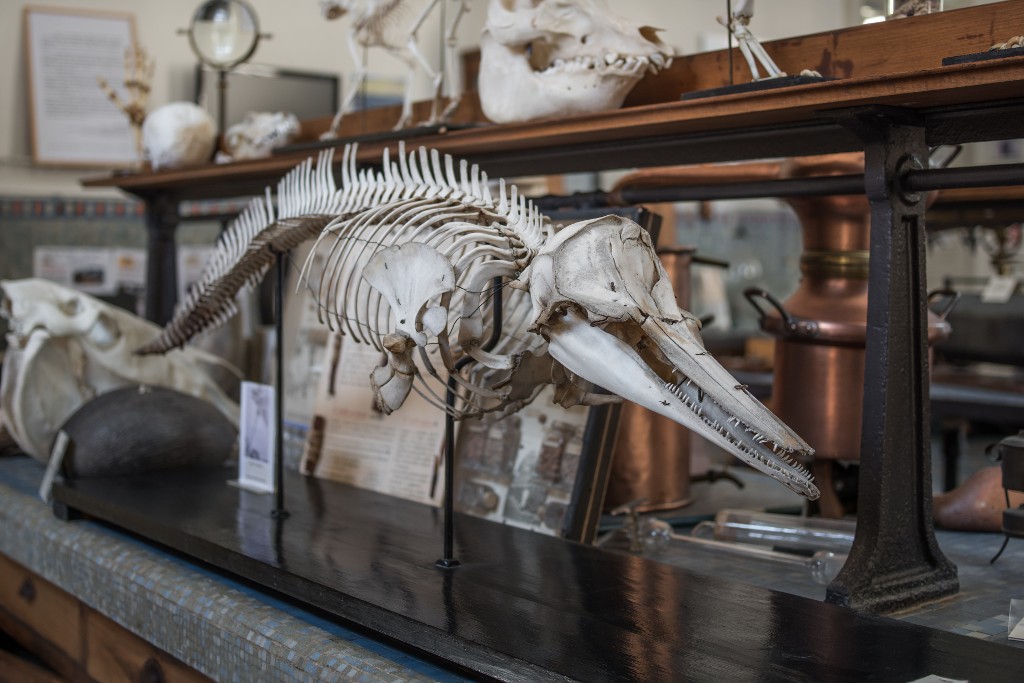 Les établissements Deyrolle sont les fournisseurs de ce squelette de dauphin. A droite, le crocodilien a été empaillé, il illustre l’enseignement qui intègre les « colonies françaises » dans les programmes scolaires.