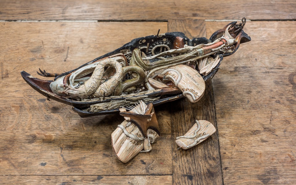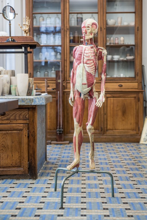 Le modèle anatomique humain complet révèle le savoir-faire des établissements Auzoux. Une pâte constituée de sciure, de colle, de morceaux de papier est moulée, puis les pièces rigoureusement numérotées sont assemblées, mais restent amovibles.