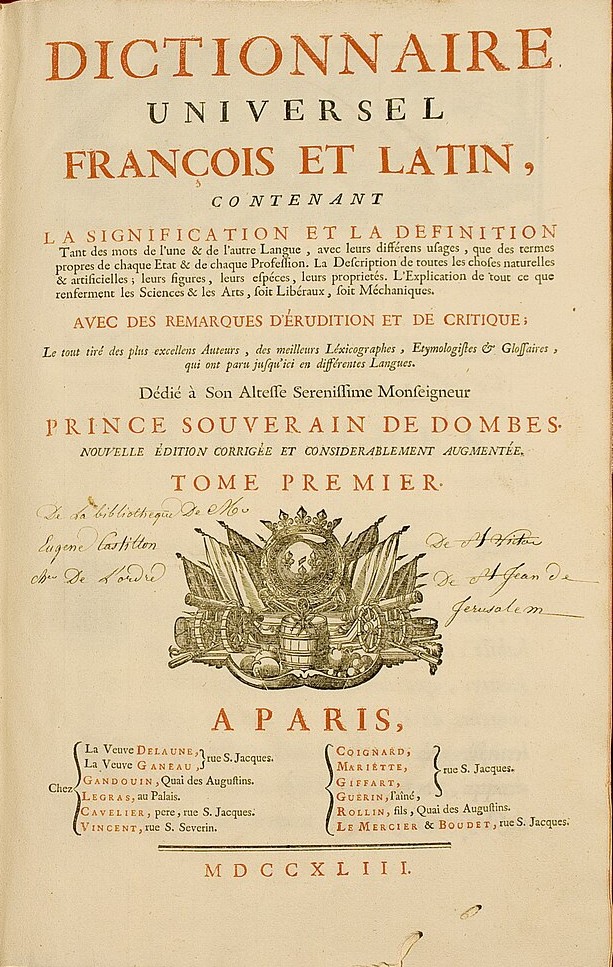 Dictionnaire universel en Franco-Latin en 3 volumes publié à Trévoux (Principauté des Dombes) est présenté comme ayant été rédigé par l’abbé Furetière. Il est expurgé de tout ce qui est contraire à la religion catholique. Les corrections portent la marque de l’apologétique de la Compagnie de Jésus. Quatre à cinq volumes de 1721 acquis par les Augustins de Rennes en 1722 figurent la la bibliothèque du Lycée.