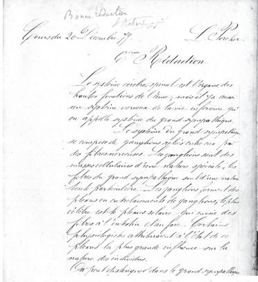 En ce qui concerne la forme, ce document témoigne de l’attachement de l’enseignement philosophique à la « leçon », on dirait aujourd’hui le cours magistral. La longueur du texte et la qualité de la rédaction laissent penser que le cours était sinon dicté, du moins dit suffisamment lentement pour que les élèves puissent faire beaucoup plus que prendre des notes à la volée. Par ailleurs cette « leçon » est aussi caractéristique de ce que les programmes depuis 1880 appellent « la liberté du professeur » qui n’est pas un simple répétiteur, mais compose son cours et en est le véritable auteur. Sur ces deux points les choses n’ont pas fondamentalement changé aujourd’hui : dans sa grande majorité le corps des professeurs de philosophie reste réfractaire à ce qu’ils considèrent comme des gesticulations pédagogiques. Le cours de philosophie reste pour l’essentiel un cours écrit que certains collègues rédigent in extenso. Le fait de faire rédiger le cours alternativement par tous les élèves de la classe s’est sans doute perdu aujourd’hui, (je l’ai pour ma part connu en 1963 quand j’étais stagiaire). Outre l’aspect pratique d’avoir une trace écrite du cours qui pouvait servir par exemple aux élèves absents (ou à l’inspecteur général !), cette pratique avait une fonction pédagogique. Il s’agit d’un exercice de rédaction et d’appropriation du cours. D’où le fait qu’il est corrigé par le maître et fait l’objet d’une appréciation. L’exercice majeur en philosophie, au milieu du XIXe, a d’abord été celui de la rédaction par lequel l’élève reproduit le cours du professeur. La dissertation au baccalauréat, apparue en 1866, s’apparentait plus à la récitation d’une question de cours qu’à la réflexion originale qu’on exige aujourd’hui des élèves. En fin de compte ce document n’est pas une simple curiosité d’archives, il interroge l’enseignant de philosophie sur l’épineux problème des rapports science/philosophie, et l’invite à réfléchir sur ce que peuvent être aujourd’hui les contenus d’un enseignement désormais essentiellement défini par sa fonction critique.
