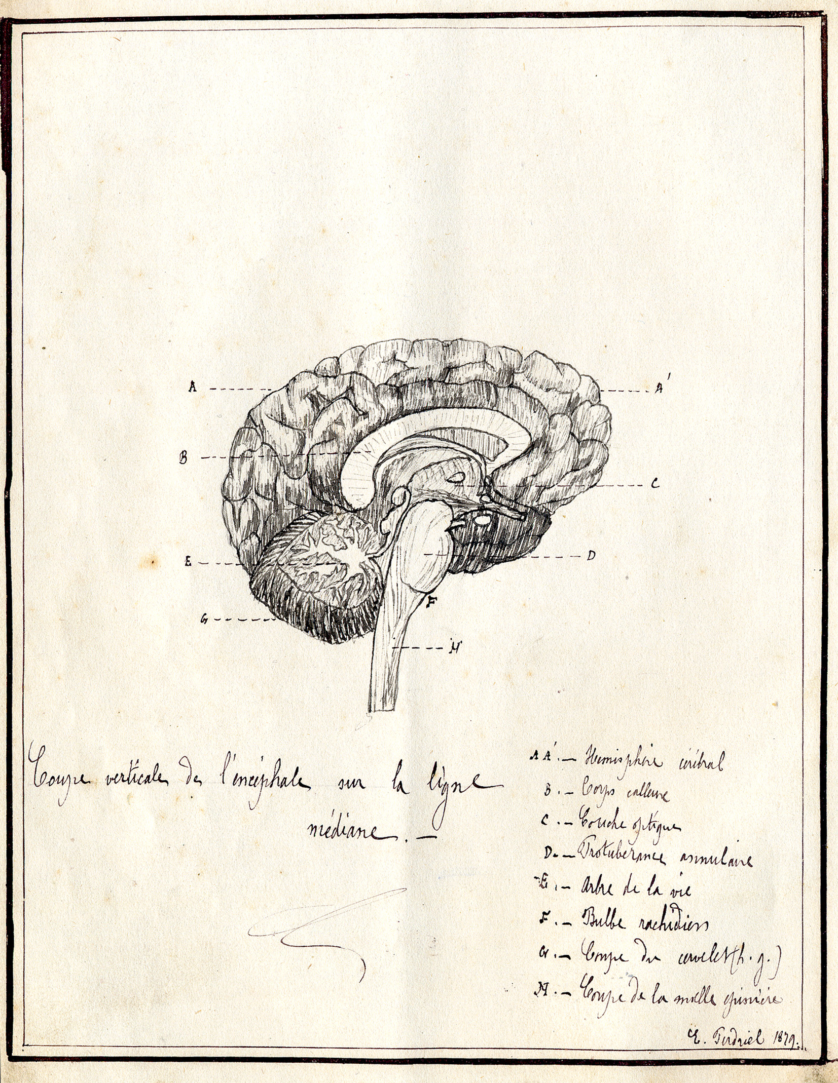 Les pages ont été écrites à la plume et à l’encre noire, tour à tour, par chacun des élèves de la classe qui inscrit son nom et qui signe. On compte ainsi 13 écritures différentes… L’appréciation du professeur (qui va de «rédaction passable » à « bonne rédaction »), ses éventuelles corrections et sa signature, ont une couleur grisée : sans doute une encre rouge qui a viré. Les cours s’étalent du 3 décembre 1879 au 6 mars 1880, à raison de 2 cours par semaine espacés de 3 jours au moins (le plus souvent le mercredi et le samedi) avec une interruption d’un mois, du samedi 27 décembre au lundi 26 janvier. La semaine de rentrée de janvier est exceptionnelle avec trois cours : lundi 26, jeudi 29, samedi 31. L’élève dont c’est le tour, effectue sa rédaction (mise au net des notes et calligraphie sur le cahier) dans l’intervalle entre deux cours : un travail considérable surtout s’il s’accompagne de réalisations de dessins comme ceux que signent L[ouis] Porcher ou E. Perdriel. Le lycée avait un professeur de philosophie, M. Pluzanski, ancien Normalien (1861) nommé à Rennes en octobre 1878, à la suite de M. F. J. Biet (prêtre). La présence de M. Robert, qui vient en voisin du Palais Universitaire tout proche, s’explique vraisemblablement par la spécificité du cours de Psychologie expérimentale dispensé. (voir, ci-dessous, l’analyse de Jacqueline Morne)